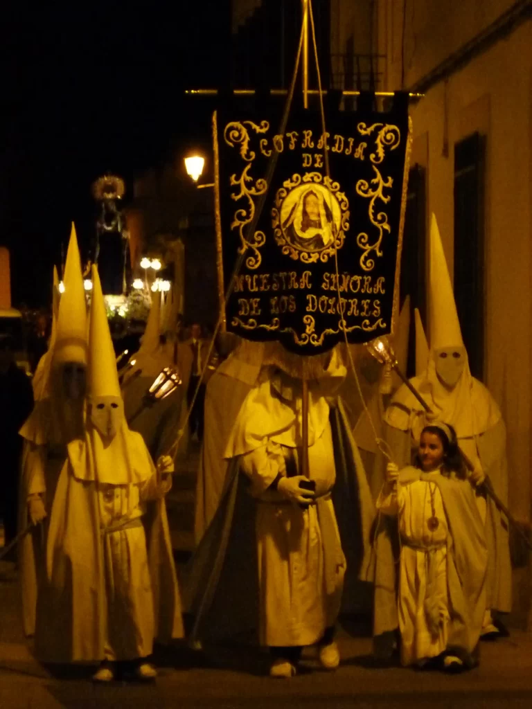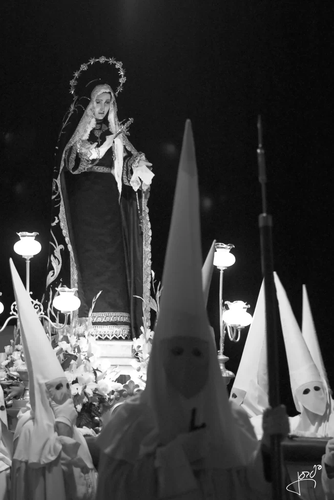 La cofradía se fundó en 1945 por iniciativa del Consejo Diocesano de Mujeres de Acción Católica, adquiriendo la imagen de Nuestra Señora de los Dolores realizada en Valencia por los escultores Román y Salvador. Inicialmente, la imagen fue custodiada por la Hermandad de Santa María, fundada en 1929. El símbolo de la cofradía es un corazón atravesado por siete puñales, representando los siete dolores de María. En 1946, se estableció el hábito de la cofradía en colores blanco marfil y azul celeste, reflejando los colores marianos.